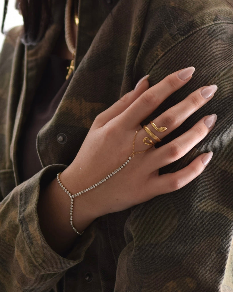 Delicate and refined, this elegant handpiece features a sparkling CZ bracelet with a graceful drop that connects to the finger. Minimal yet eye-catching, it's the perfect piece for adding a touch of shimmer and sophistication.