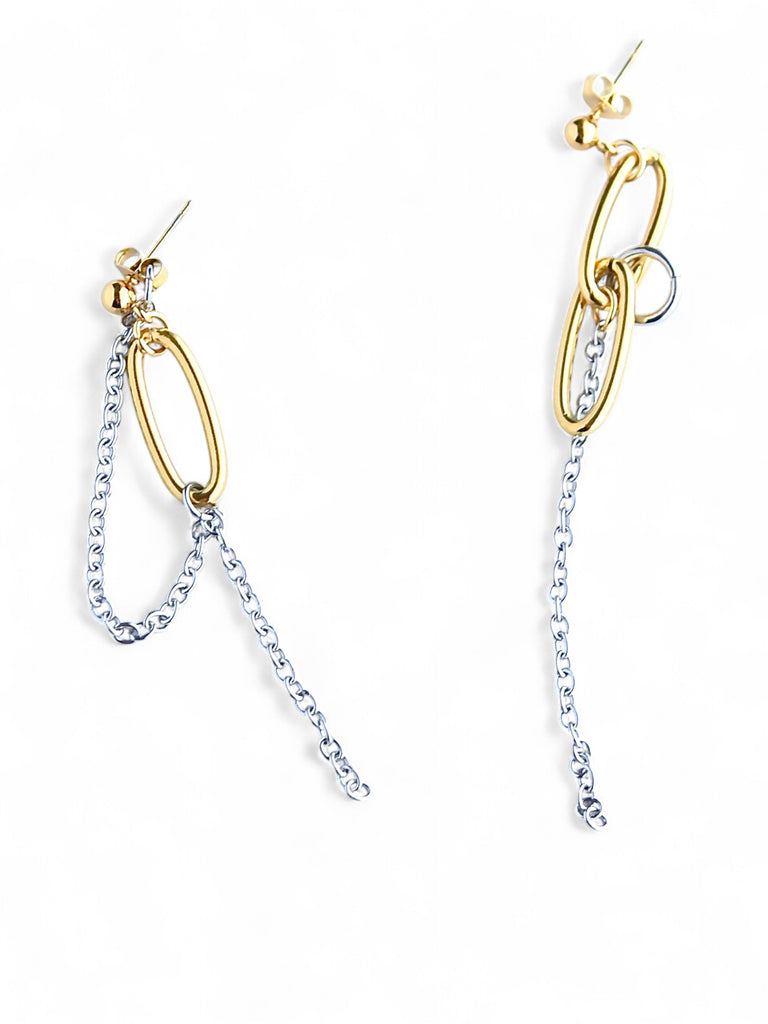 Bold and playful, the Double Trouble earrings mix metals and mismatched chain drops for an edgy statement look. Modern and unexpected, they bring instant attitude to any outfit.