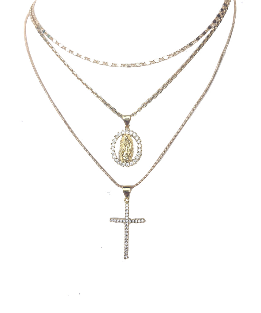 3 Layer Necklace-- Mother Mary & Cross pendants