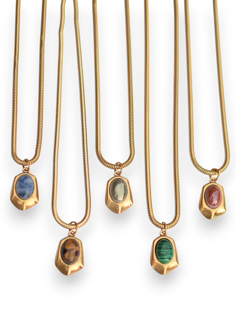 Turn heads with the Rock My World necklace—a vintage-inspired thick snake chain paired with a sleek gold setting. At its center rests a striking oval cabochon stone, available in red, green, light blue, gray, or brown, making it a bold statement piece with timeless appeal.