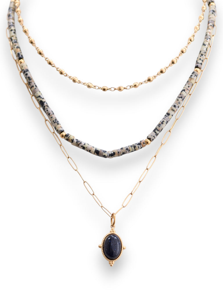 Layered to perfection, the Triple Threat necklace combines three unique strands: a gold ball chain, a black-and-white spotted jasper beaded strand, and a long gold paperclip chain finished with a vintage-inspired oval black cabochon pendant. Bold, eclectic, and endlessly stylish, it's a statement piece that does it all.