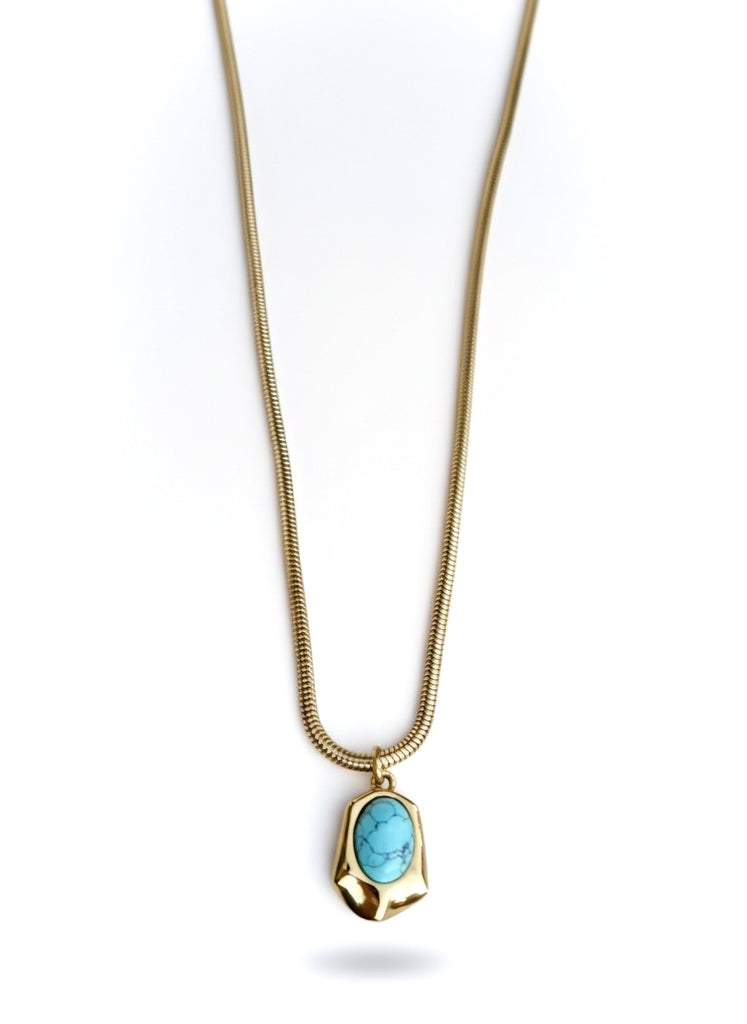 Turn heads with the Rock My World necklace—a vintage-inspired thick snake chain paired with a sleek gold setting. At its center rests a striking oval cabochon stone, available in red, green, light blue, gray, or brown, making it a bold statement piece with timeless appeal.