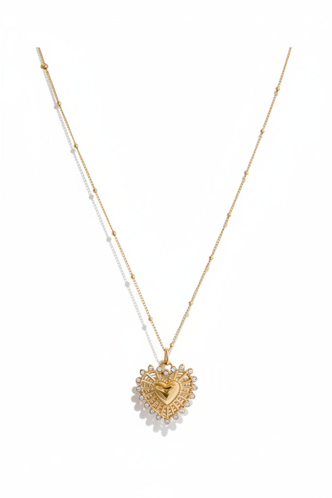 A simple gold chain finished with a bold heart pendant accented with CZ detail. Timeless with a touch of sparkle, this piece makes an effortless statement.