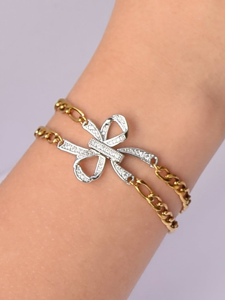 Sweet meets statement in the Ties That Bind bracelet, featuring a sparkling platinum CZ bow clasp at the center. Two layers of sleek gold figaro chain complete the look, making it equal parts feminine and bold.